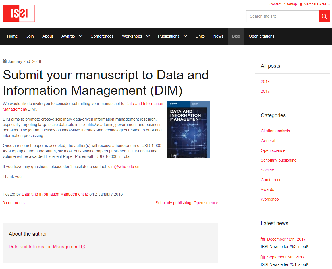 2018年1月2日,國際科學(xué)計量學(xué)和信息計量學(xué)學(xué)會(ISSI)在其官方網(wǎng)站專門報道了由武漢大學(xué)信息管理學(xué)院和信息資源研究中心主辦的英文期刊Data and Information Management(DIM)。報道不僅對英文期刊做了介紹,還向作者大力推薦期刊并誠摯邀稿。