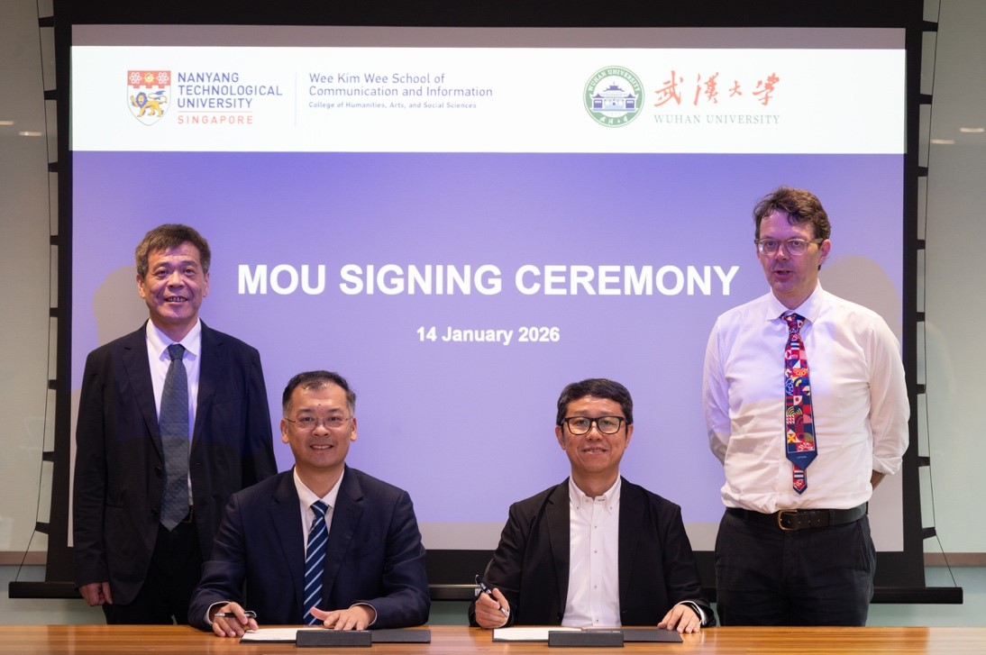 1月14日,我院和南洋理工大學(xué)黃金輝傳播與信息學(xué)院舉行合作會談。南洋理工大學(xué)人文、藝術(shù)與社會科學(xué)學(xué)院(College of Humanities, Arts, and Social Sciences,COHASS)院長Jon Wilson教授、副院長Dion Goh教授,黃金輝傳播與信息學(xué)院院長Jack Qiu教授、Jung Younbo副教授、Alton Chua副教授等出席。雙方介紹了各自學(xué)院的基本情況,并圍繞數(shù)字人文、游戲文化、信息傳播等方向,就聯(lián)合科研、學(xué)生交流、學(xué)術(shù)資源共享及平臺共建等議題進(jìn)行了深入交流。在此基礎(chǔ)上,雙方簽署了合作諒解備忘錄,為武漢大學(xué)游戲文化研究中心與南洋理工大學(xué)黃金輝傳播與信息學(xué)院開展長期、穩(wěn)定的合作奠定了堅實基礎(chǔ)。
