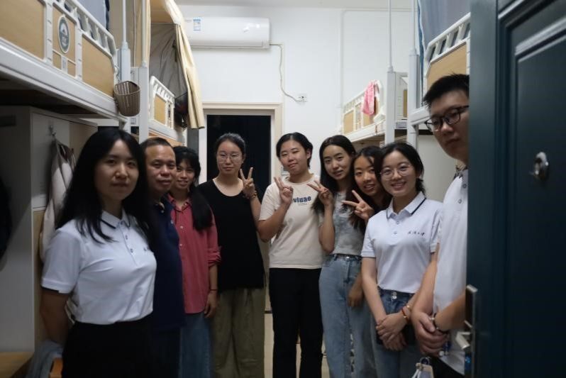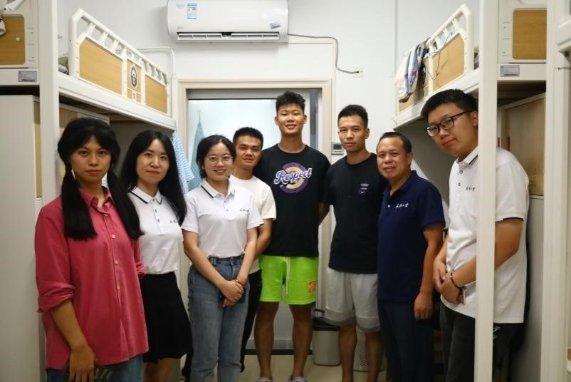 Yaolin Jiang, CPC Deputy Secretary of our School, Qiuyan Fan, Counselor, Chenchen Li, part-time counselor, and Yi He, part-time counselor, visit the new students' dormitory
