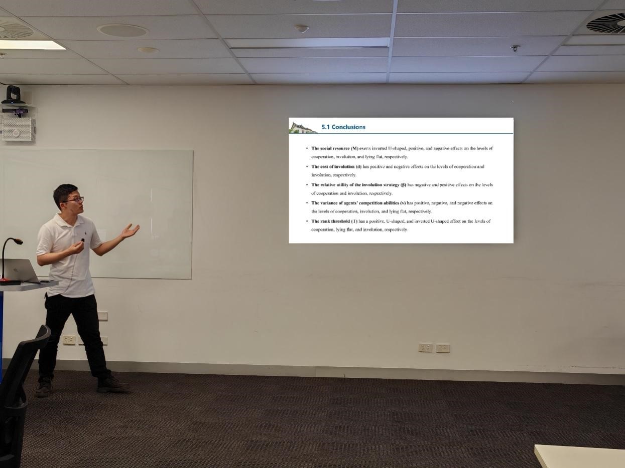 Chaocheng He, Associate Professor in the Department of Digital Economy and Intelligent Business at our school, presented a study titled Involution-Cooperation-Lying Flat Game on a Network-Structured Population in the Group Competition. This presentation covered concepts like "involution-lying flat," social-technical game models, simulation experiment settings, and analysis of simulation results. The related paper has been published in the international journal IEEE Transactions on Computational Social Systems.