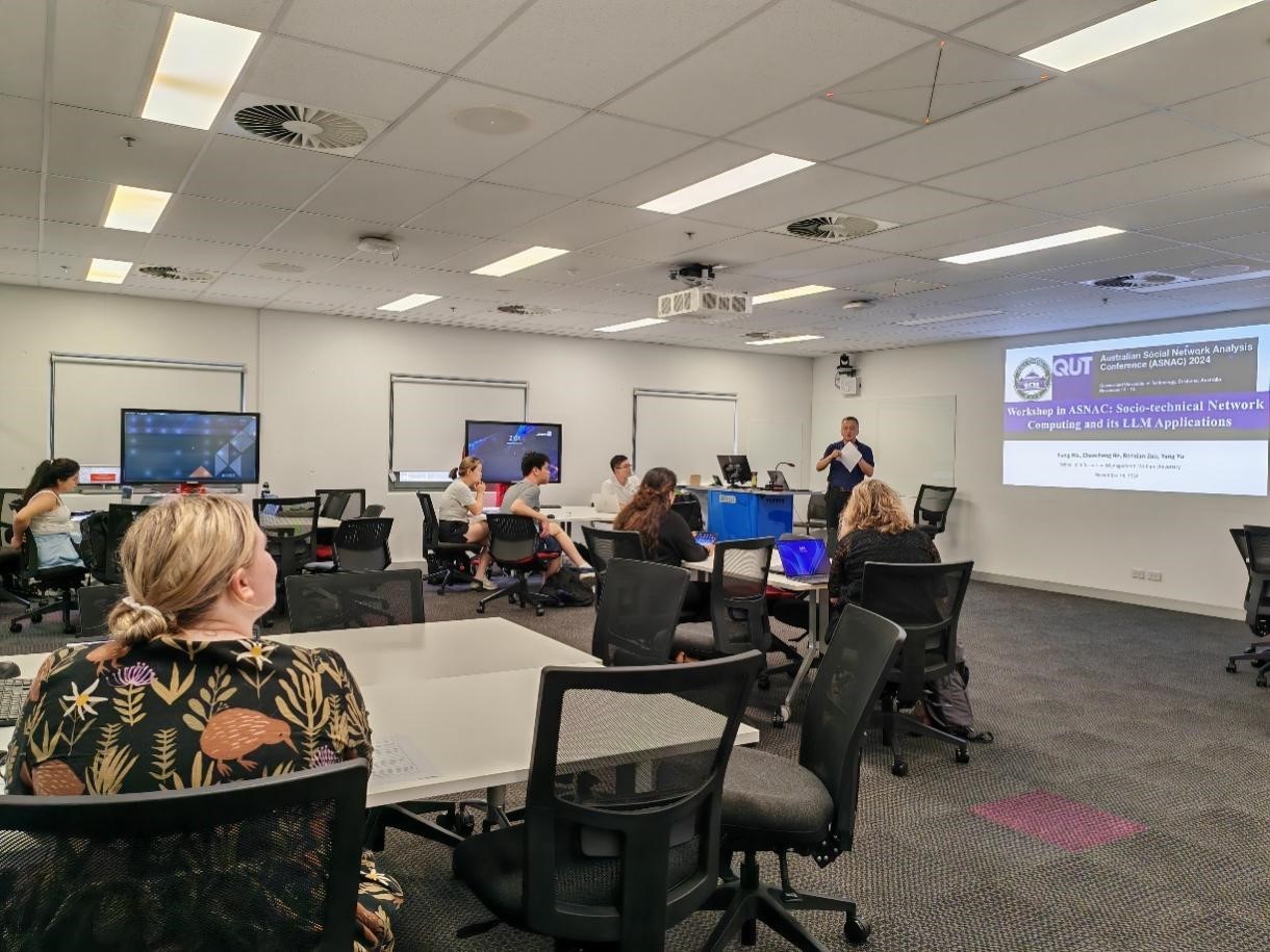 The 2024 Australian Social Network Analysis Conference (ASNAC 2024) was held at Queensland University of Technology in Brisbane, Australia, from November 13th to 15th. Professor Jiang Wu’s group organized a workshop titled Social-Technical Complex Network and its LLM Applications. At this workshop, Professor Jiang Wu introduced the concept of "social-technical networks" and analyzed the theme of Socio-technical Network Computing and LLM Simulation from aspects such as "social-technical bipartite networks" and "social-technical temporal networks," along with their applications in the field of information resource management.