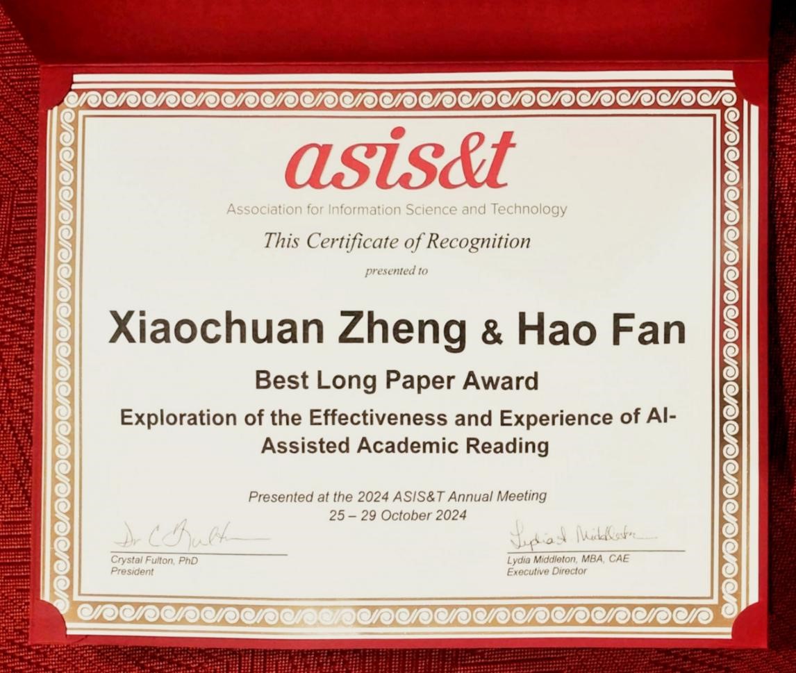 The article Exploration of the Effectiveness and Experience of AI-Assisted Academic Reading won the only "Best Long Paper Award" at the 87th Annual Meeting of ASIS&T (Association for Information Science and Technology), which was held from October 25th to 29th. This is the first time that our School, as corresponding author's affiliations of an article, has won this award, and it is also a breakthrough for China’s universities and colleges in recent years.