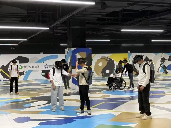 作為湖北省首個(gè)國風(fēng)大空間 VR 極致互動體驗(yàn)項(xiàng)目,“逍遙武當(dāng)” 以世界文化遺產(chǎn)武當(dāng)山為創(chuàng)作基底,運(yùn)用前沿虛擬現(xiàn)實(shí)技術(shù),構(gòu)建出集道教文化、武當(dāng)武術(shù)與古建筑藝術(shù)于一體的沉浸式體驗(yàn)場景。在項(xiàng)目現(xiàn)場,同學(xué)們佩戴專業(yè)設(shè)備親身參與,直觀感受數(shù)字化技術(shù)如何讓千年文化遺產(chǎn)“活”起來,深刻體悟科技與人文融合的創(chuàng)新張力。