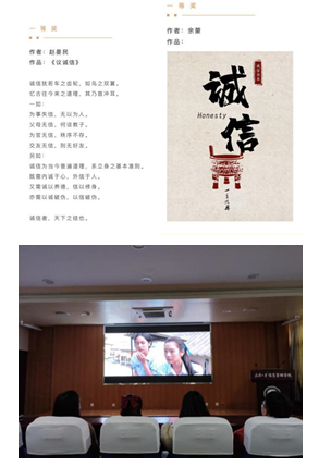 為將誠信意識切實內(nèi)化為自身修養(yǎng),學院還舉辦了誠信觀影、誠信作品征集等多元化特色活動。12月11日-18日,舉辦第一屆“我誠創(chuàng)我信”誠信創(chuàng)意作品征集活動,評選出語言文字類、平面設計類作品一、二、三等獎及優(yōu)秀獎;12月24日,“學術有道,誠信立研”學術誠信觀影活動順利舉行,同學們在觀看誠信道德主題電影《天才槍手》中加深了對“誠信”一詞的認識,領悟到“誠信是學術的生命線”這一道理。