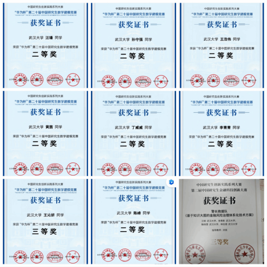 2023年,我院研究生在多項(xiàng)賽事中斬獲佳績,共獲國家級獎項(xiàng)14項(xiàng)、30人次獲獎。在“華為杯”第二十屆中國研究生數(shù)學(xué)建模競賽中,我院研究生擔(dān)任三支隊(duì)伍隊(duì)長,組織團(tuán)隊(duì)參賽。我院教授孫永強(qiáng)指導(dǎo)、陳峰(隊(duì)長)團(tuán)隊(duì)以“大規(guī)模創(chuàng)新類競賽評審方案研究”為研究問題提交項(xiàng)目,我院副教授賀超城指導(dǎo),李欣儒(隊(duì)長)團(tuán)隊(duì)以以“面向群組決策的大規(guī)模創(chuàng)新類競賽評審方案改進(jìn)研究”為研究問題提交項(xiàng)目,黃茜(隊(duì)長)、孫守強(qiáng)、李青青團(tuán)隊(duì)和汪璠(隊(duì)長)、王浩偉、丁威威團(tuán)隊(duì)以“出血性腦卒中臨床智能診療建模”為研究問題提交項(xiàng)目,均獲二等獎。我院研究生王沁妍所在團(tuán)隊(duì)以“出血性腦卒中臨床智能診療建模”為題提交項(xiàng)目獲三等獎。