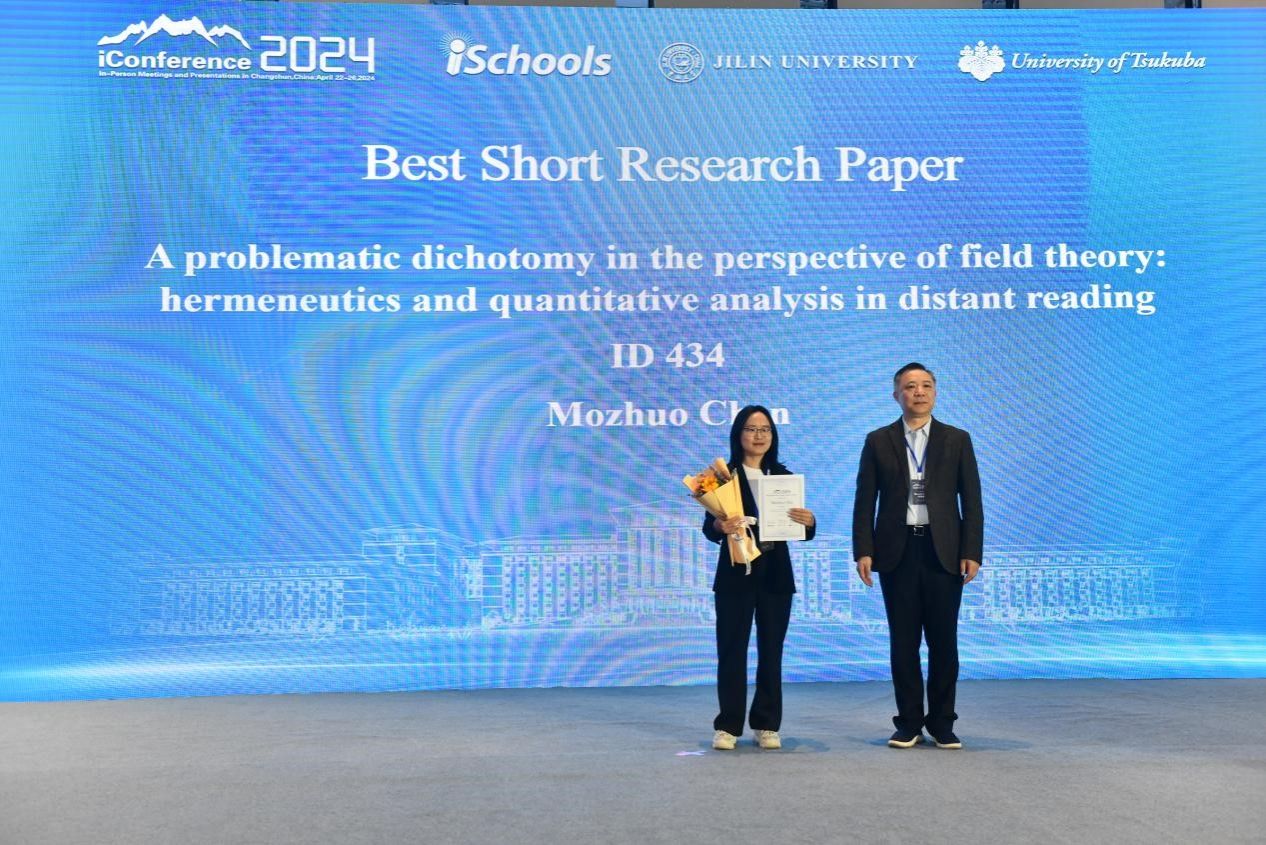 本屆會議共錄用我院師生為第一作者的中英文長論文(Full Research Papers)8篇、英文短論文(Short Research Papers)5篇、英文海報(Poster)4篇、中文論文6篇、中文海報3篇。副院長王曉光教授主持中文主旨報告,副院長周力虹教授作為iSchools聯(lián)盟三人核心小組成員(Treasurer)主持開幕式主旨報告,安璐教授參加中文論壇擔任點評嘉賓,毛進副教授等撰寫的中文論文《基于弱信號三維框架的新興主題早期識別方法研究》獲評最佳中文論文。