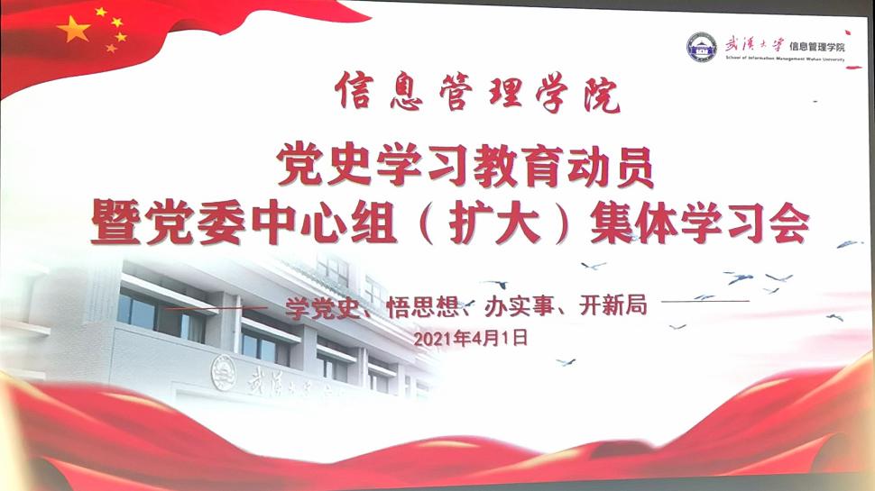 (通訊員夏蘇迪 攝影黃國英、鄭小川)為認真學(xué)習(xí)貫徹習(xí)近平總書記在黨史學(xué)習(xí)教育動員大會上的重要講話精神,高質(zhì)量開展黨史學(xué)習(xí)教育,根據(jù)學(xué)校黨委的統(tǒng)一部署和要求,4月1日下午,信息管理學(xué)院黨委召開黨史學(xué)習(xí)教育動員暨黨委中心組(擴大)集體學(xué)習(xí)會,對全院黨史學(xué)習(xí)教育工作進行動員部署。學(xué)院黨委書記付興榮做學(xué)習(xí)教育動員報告,黨委副書記江堯林介紹黨史學(xué)習(xí)教育實施方案,黨委副書記代茜主持大會。學(xué)院全體在職教職工黨員,離退休教職工黨員代表,本科生黨支部和研究生黨支部全體支委及黨員代表參加會議。