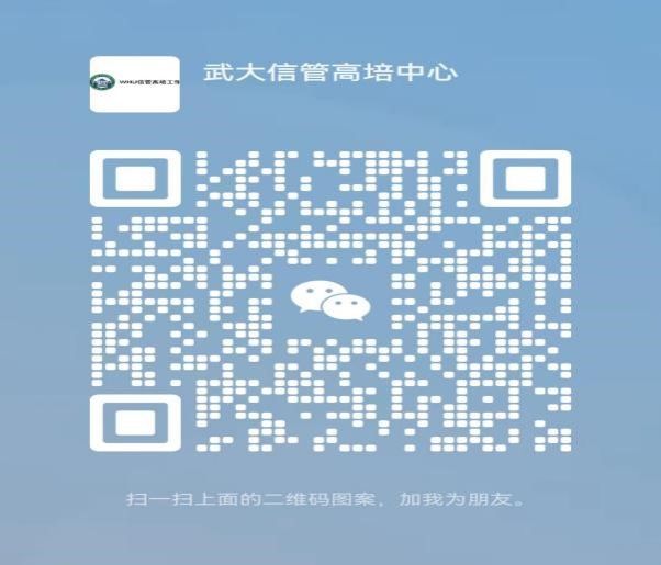 4、參訓(xùn)學(xué)員請用微信掃下方二維碼添加研修班辦公微信:“武大信管高培中心”(微信號:wdxggpzx666), 并請?zhí)顚戲炞C信息“姓名+首屆全國數(shù)字素養(yǎng)與技能提升高級研修班”。 研修班將建立微信群。